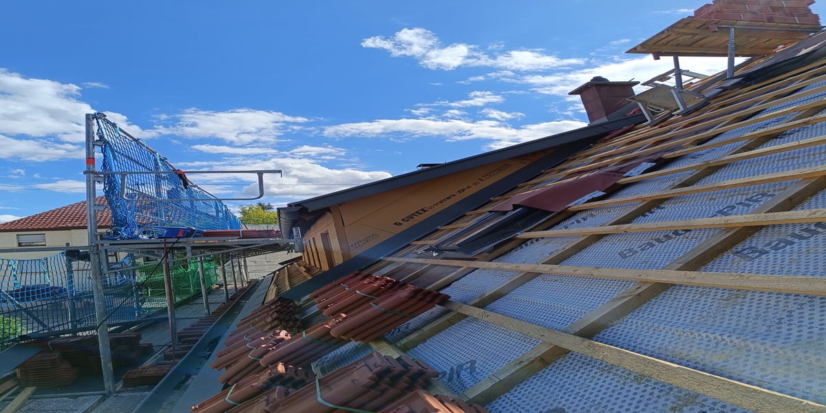 Ein besonderes Highlight ist die geschlossene Vorhangfassade an den Gauben, die aus sibirischer Lärche gefertigt wurde. Diese ist im Nut- und Feder-System ausgeführt und sorgt durch die Rombusschallung für eine ansprechende Optik sowie zusätzlichen Schutz. Die Blecharbeiten wurden mit Preffal, einer aluminium-beschichteten Blechlösung, ausgeführt, um eine langlebige und wetterbeständige Abdeckung zu gewährleisten. Die Dachdeckung erfolgte mit Erlus E 58S Ziegeln in Rot, die engobiert wurden und somit eine ansprechende Optik sowie Schutz vor Witterungseinflüssen bieten. Die gesamte Sanierung wurde innerhalb von etwa acht Wochen abgeschlossen, sodass das Projekt effizient und professionell umgesetzt wurde.